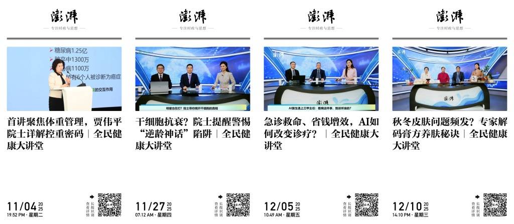 线上传播构建起广泛覆盖的立体网络。澎湃新闻首页设立入口(),平台内两大核心板块协同发力:“直播”板块提前3-7天为每期节目置顶预告,同步联动健康频道发布深度解读文章、主题海报及核心要点梳理,形成“预告-直播-回放-短视频传播-图文解读”的完整内容闭环;“咨询”板块则为公众提供全时段健康问答服务——直播开播前,用户可提前提交健康疑问,由专家在直播中针对性回应。日常有健康困惑时,用户也可随时登录并在“咨询”板块提问,问题覆盖常见病防治、日常保健、康复指导等多个核心领域,均由专家团队驻场给出专业解答,有效延伸服务链条、增强互动性与实用性。