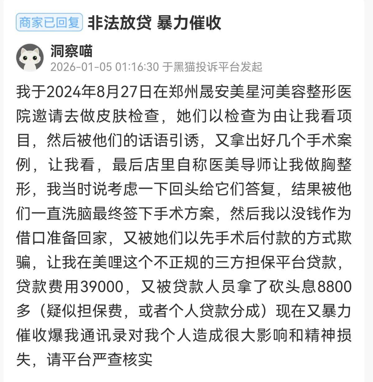 华体会电竞,华体会电子,华体会体育官网,华体会靠谱吗,华体会APP,华体会官方网站,华体会网址,华体会官方平台,华体会app下载,华体会体育靠谱吗,华体会2025最新,华体会世界杯,华体会欧洲杯该消费者进一步指出,其随后以没钱为由准备离开,却又被该机构以“先手术后付款”的方式诱导,最终在第三方担保平台“美哩”办理了贷款,金额为39000元。在此过程中,贷款方还收取了高达8800余元的“砍头息”。此后,该消费者遭遇了暴力催收,包括通讯录被曝,对其个人生活与精神造成了严重困扰和损失。为此,她希望投诉平台能严查并核实此事。截至深度美业发稿前,黑猫投诉平台显示,商家已对此投诉作出回复,案件仍在处理之中。